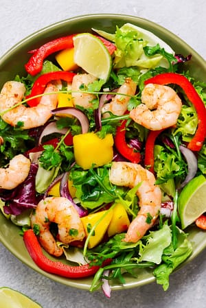 - Place the shrimp, tomato, onion, bell pepper, and red chili in a bowl.